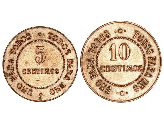 COOPERATIVE AND ADVERTISING TOKENS - Lote 2 fichas 5 y 10 Céntimos. 1905. SOCIEDAD COOP. DE CONSUMOS, PRODUCCIÓN Y CRÉDITO. LA GUARDIOLA COLECTIVA. AE. Ø 25 y 27 mm. RARAS. L-895 y 896. MBC+.
