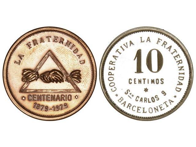 COOPERATIVE AND ADVERTISING TOKENS - Lote 2 reproducciones fichas 10 Céntimos. S/F (1979). COOPERATIVA LA FRATERNIDAD. SAN CARLOS 9. BARCELONETA. AR y AE. Centenario Cooperativa (1879-1979). (Leves rayitas). SC y PROOF.