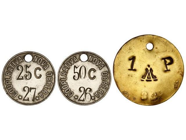 COOPERATIVE AND ADVERTISING TOKENS - Lote 3 fichas 25, 50 Céntimos y 1 Peseta. Guerra Civil. COOPERATIVA NOVA OBRERA. SANTS. Al y latón. Ø 30 y 40 mm. MUY RARAS. L-1743, 1744, 1748. EBC- y MBC+.