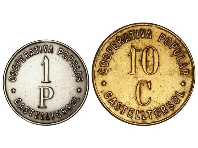 COOPERATIVE AND ADVERTISING TOKENS - Serie 2 fichas 10 Céntimos y 1 Peseta. S/F. COOPERATIVA POPULAR. CASTELLTERSOL. Latón y Ni. Ø 27 y 30 mm. L-19 y 20. MBC+.