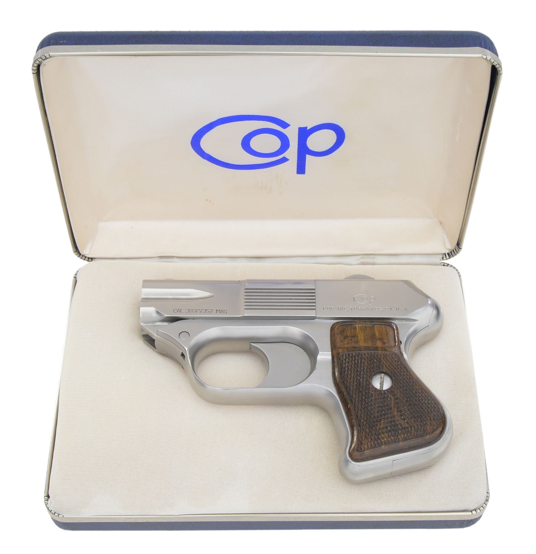 Cal. 38 Sp. / 357 Mag. S# 008733. Bbls. 3" four shot cluster. Semi circular front sight, rear sight doubles as bbl. latch. Stainless steel construction. 2 Piece checkered wood grips. COP stands for "Compact Off-Duty Police". UNATTACHED ACCESSORIES: COP marked display box w/ blue naugahyde exterior w/ foam padded beige interior. CONDITION: near excellent, stainless finish shows light scuffs. Near excellent bores. (19-5625/DS). MODERN. $500-750.