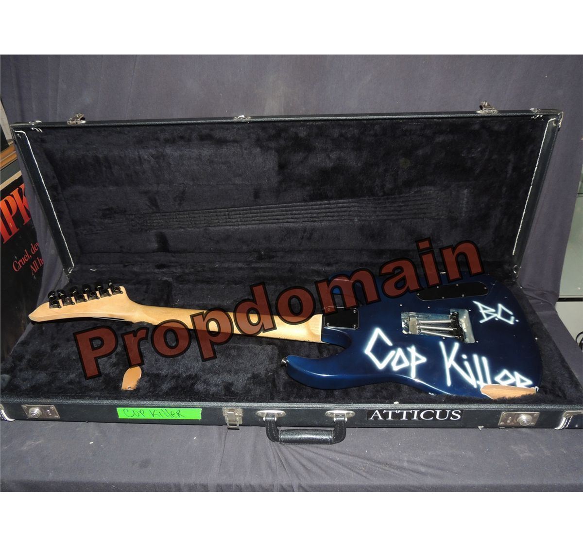 This is the OOAK custom hand made in the US Neal Mozer guitar Ernie C [Cunningham] played the song in the studio. It is also the only guitar he ever performed the song live on stage with. He played the hell out of this guitar! To the point where, though still playable, he deemed it no longer stage worthy! He then gave it to a roadie who stored it at a famous F/X artist's home, until I came along, and made them both a cash offer they could not refuse. Comes complete with the original tour case marked "COP KILLER" and "ATTICUS" which I believe was the last band they toured with.