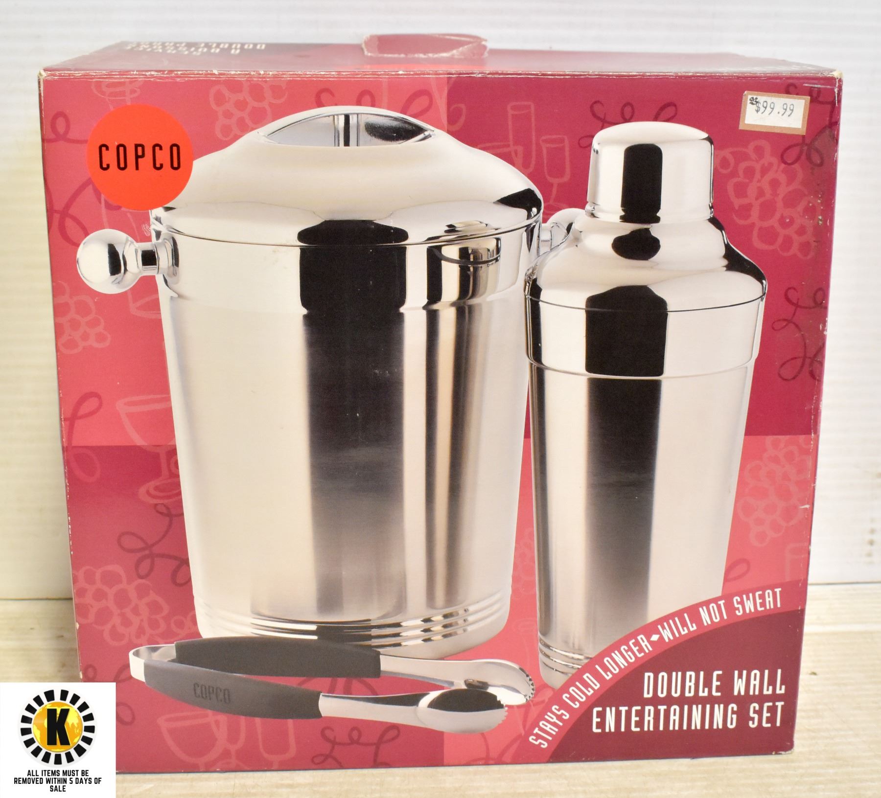 COPCO DOUBLE WALLED 18/8 STAINLESS STEEL WILL NOT SWEAT . INCLUDED IN THE SET IS ICE BUCKET ICE TONGS 20OZ SHAKER