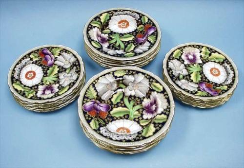 COPELAND, ENGLAND - A 24 piece antique porcelain table service comprising of 12 soup bowls and 12 flat plates. Each piece is hand painted in the "Green House" pattern with colourful flowers. Underglaze hallmarked, numbered and "Daniel, London" distributor marks on underside. 7500-8500