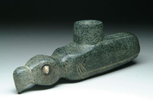 COPENA TYPE HAWK EFFIGY PIPE. Black steatite with eye insets of bone or shell. Middle Woodland, Circa 300-500AD style. SIZE: 8-1/4in. l x 3in. h. CONDITION: Very good. 9-25984-3 The Tennessee Collection of Prehistoric Indian Artifacts from the Allen Graves Estate. SPECIAL NOTE: We do not regularly sell Prehistoric Indian stone artifacts and therefore have very little experience and no expertise in this area. All of the following lots have come from the Collection of the Late Allen Graves of Tennessee. The collection was inherited some years back by his daughter, who now lives in Maine. This collection was consigned to us directly from her. We employed someone to generally identify styles and types, but as stated above, due to our lack of expertise in this field, we can not guarantee the age or origin of the following pieces. We are relying on you, the buyer, to determine to your satisfaction the origin and age of each item in the collection.