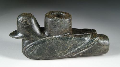 COPENA TYTPE GREAT PIPE DUCK EFFIGY. Black steatite, middle Woodland. Circa 300-500AD style. SIZE: 9in. l x 4-1/4in. h. CONDITION: Very good. 9-25984-38 The Tennessee Collection of Prehistoric Indian Artifacts from the Allen Graves Estate. SPECIAL NOTE: We do not regularly sell Prehistoric Indian stone artifacts and therefore have very little experience and no expertise in this area. All of the following lots have come from the Collection of the Late Allen Graves of Tennessee. The collection was inherited some years back by his daughter, who now lives in Maine. This collection was consigned to us directly from her. We employed someone to generally identify styles and types, but as stated above, due to our lack of expertise in this field, we can not guarantee the age or origin of the following pieces. We are relying on you, the buyer, to determine to your satisfaction the origin and age of each item in the collection.