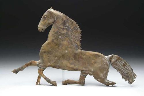 COPPER BLACKHAWK WEATHERVANE. Antique weathervane shows a trotting horse with cut mane and flowing tail. This horse was found while excavating an underwater dump. SIZE: 21” l x 15” t. CONDITION: The vane is as is, with one leg detached, one ear missing. Mostly intact. 9-27539