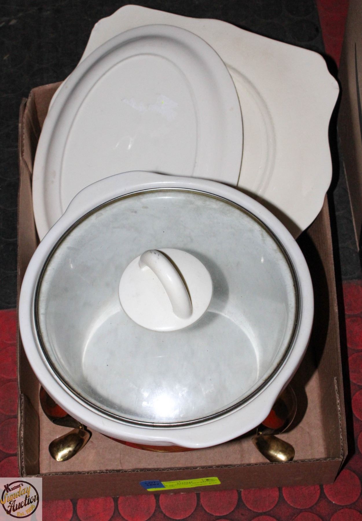 LIDDED SERVING CHAFING DISH WITH SPOT TO HOLD HEAT SOURCE + 2 VINTAGE/ANTIQUE SERVING PLATES (5PCS TOTAL) **ALL ITEMS MUST BE REMOVED BY 5PM SATURDAY, MAY 31ST 2025. ALL REMAINING ITEMS WILL BE SUBJECT TO A $6.00 PER DAY STORAGE CHARGE. ANY ITEMS REMAINING AFTER MONDAY, JUNE 16TH 2025 WILL BE CONSIDERED FORFEITED. NO REFUNDS WILL BE ISSUED FOR FORFEITED ITEMS. TO SCHEDULE A PICK UP APPOINTMENT CLICK HERE