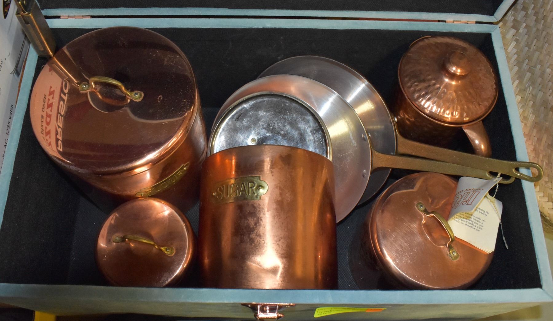 PANS IN VELVET/COPPER HIP TRUNK-ESTATE**ALL ITEMS MUST BE REMOVED BY 5PM MONDAY, OCTOBER 17TH, 2022. ALL REMAINING ITEMS WILL BE SUBJECT TO A $6.00 PER DAY STORAGE CHARGE. ANY ITEMS REMAINING AFTER MONDAY, OCTOBER 29, 2022 WILL BE CONSIDERED FORFEITED. NO REFUNDS WILL BE ISSUED FOR FORFEITED ITEMS. TO SCHEDULE A PICK UP APPOINTMENT CLICK HERE