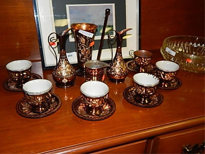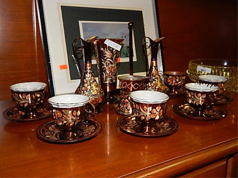 COPPER ENGRAVED TEA SET - 16 PC
