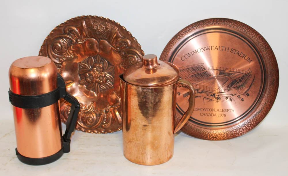 COPPER TRAY; COPPER THERMOS; LIDDED COPPER QUART PITCHER