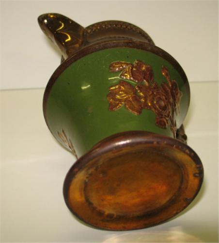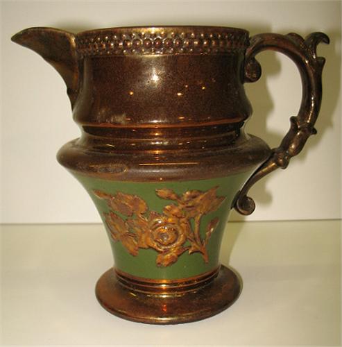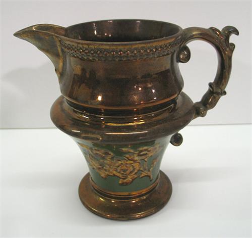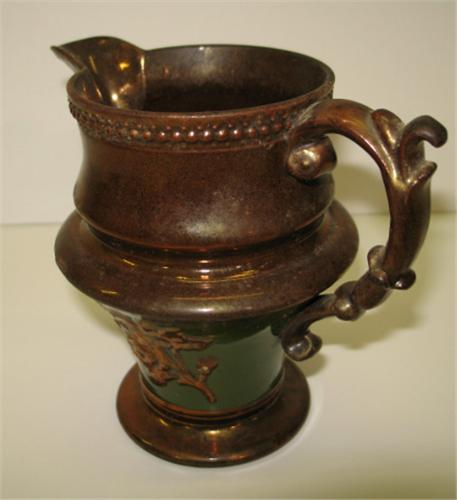 COPPER LUSTER CREAMER. Relief floral decorated around body with green background. Shops loss to luster. 5.75" H