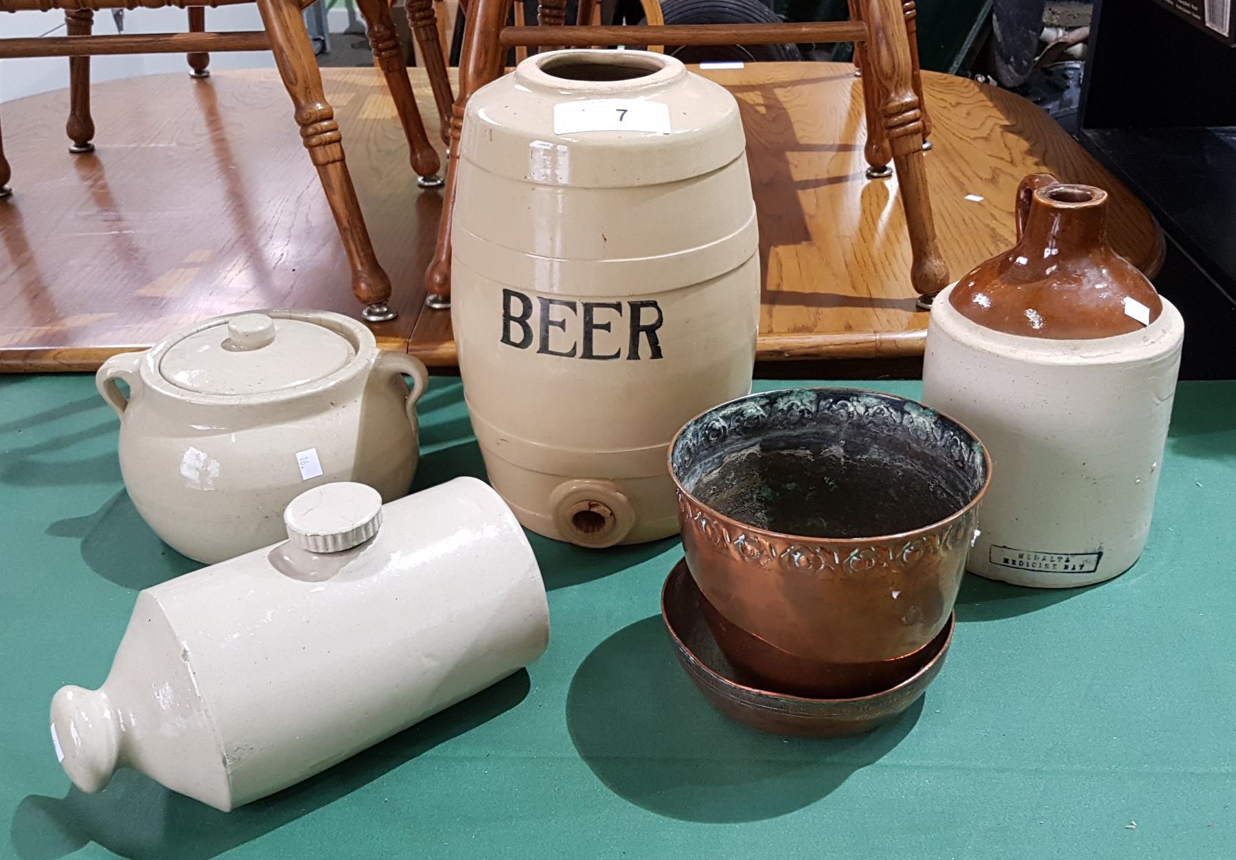 BEER CROCK, WHISKEY CROCK, MEDALTA BEAN POT (HAS A CRACK), & FOOT WARMER
