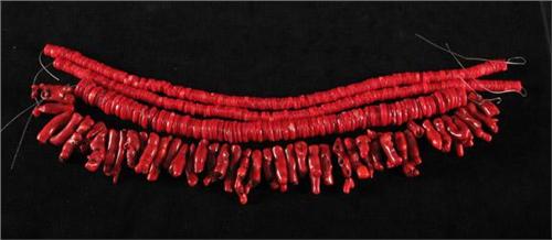 Lot coral beads to include one 14'' strand of 0.75'' diameter flat disc beads, one 17'' strand of 0.25'' diameter disc beads, and one 15'' strand of 1'' branches.