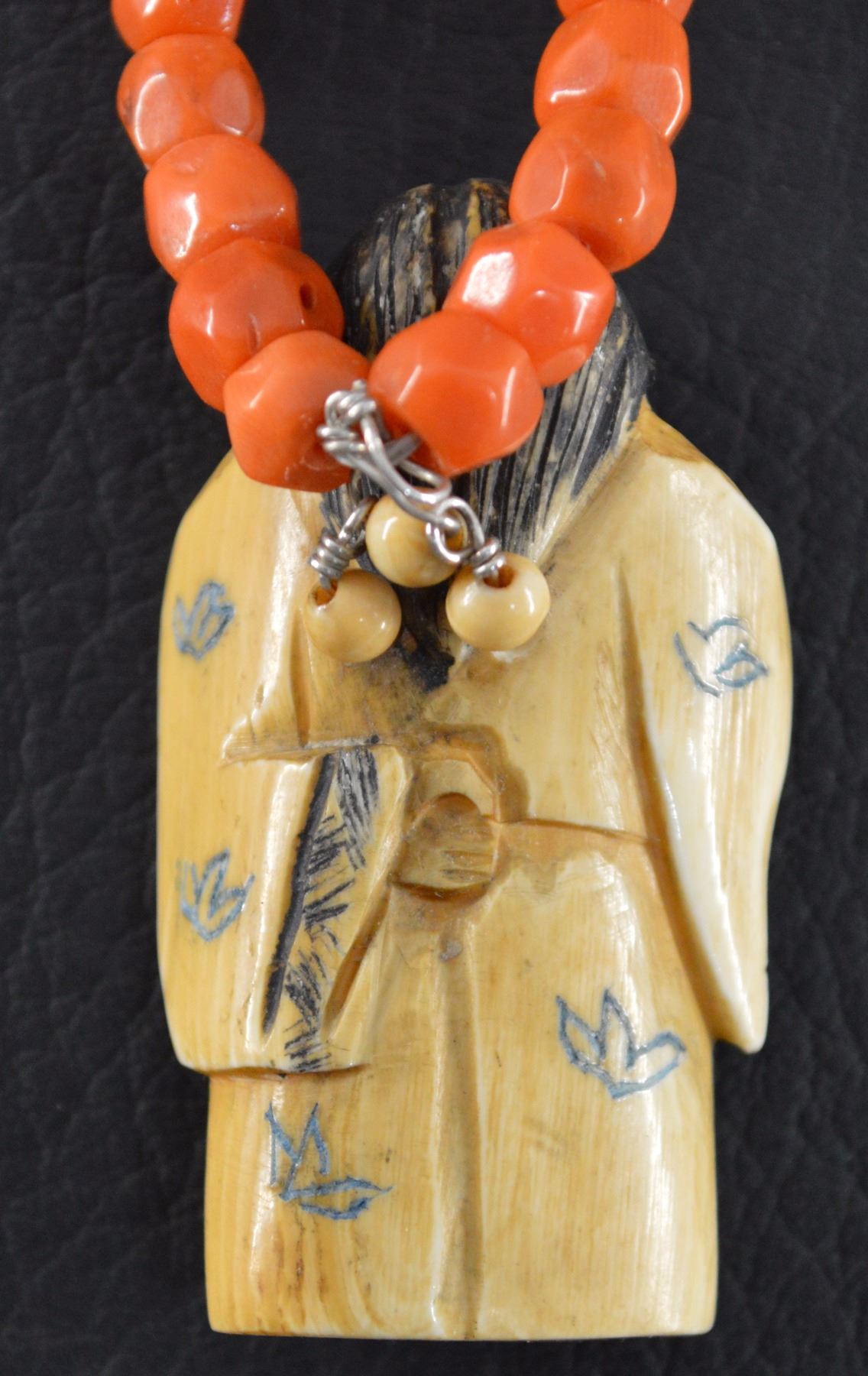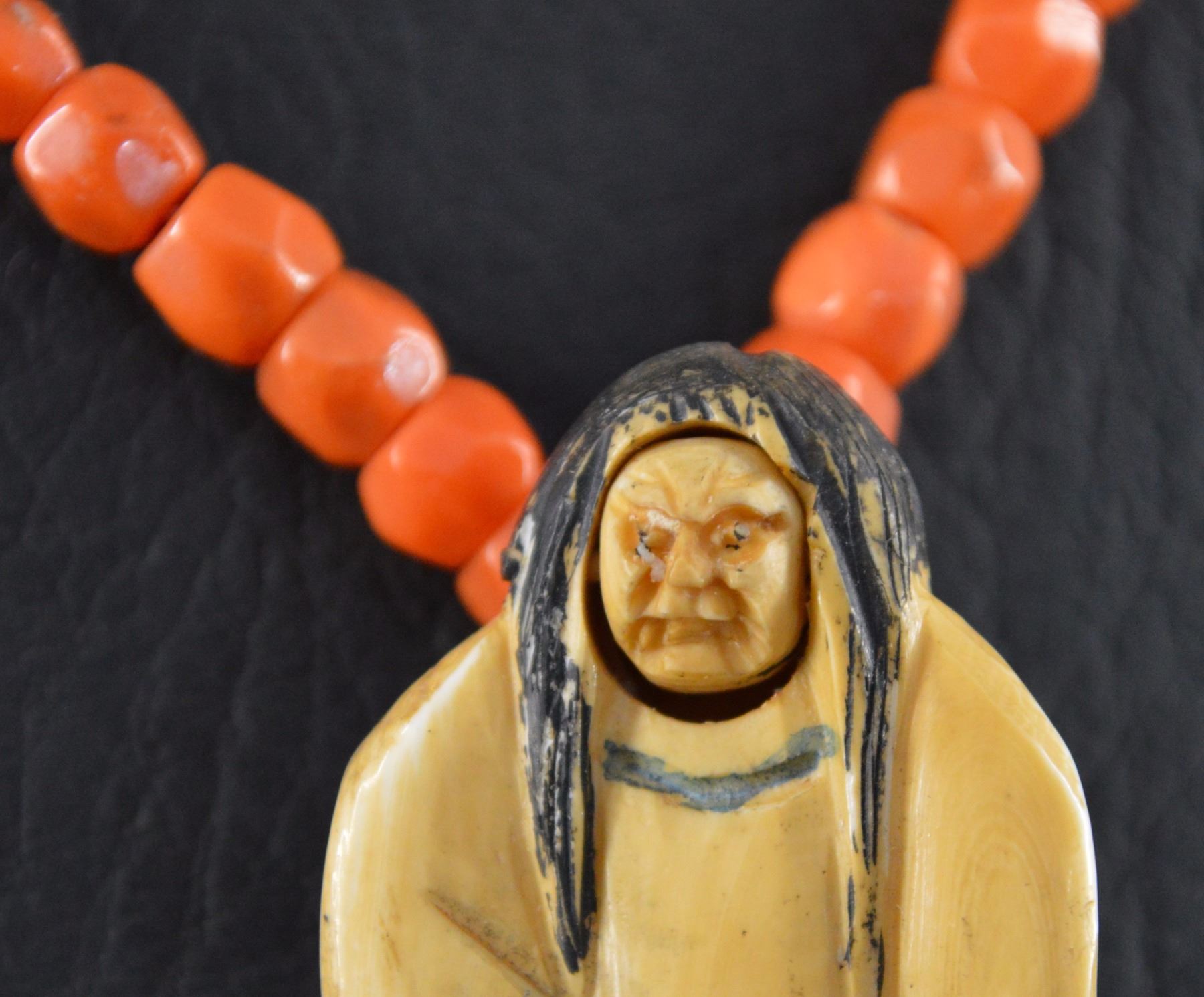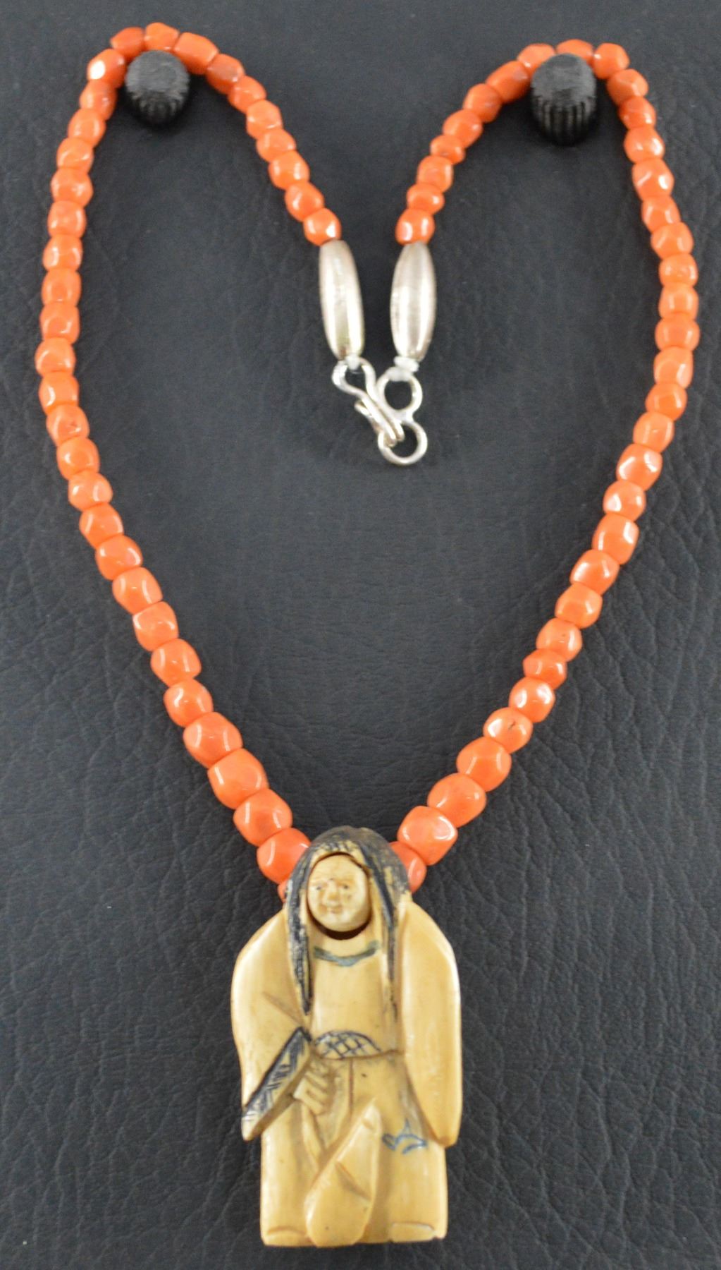 Age unknown. Hand faceted coral beads with two face carved pendant.