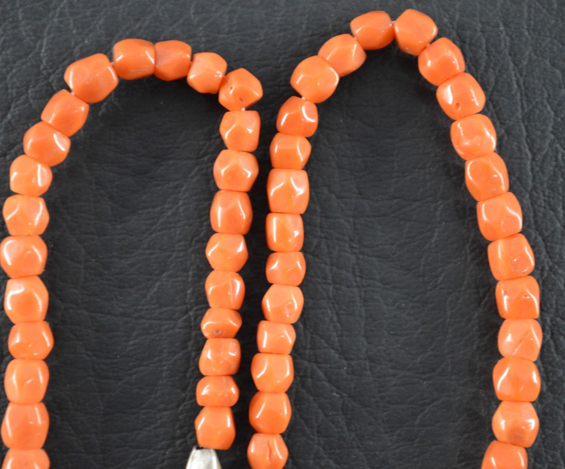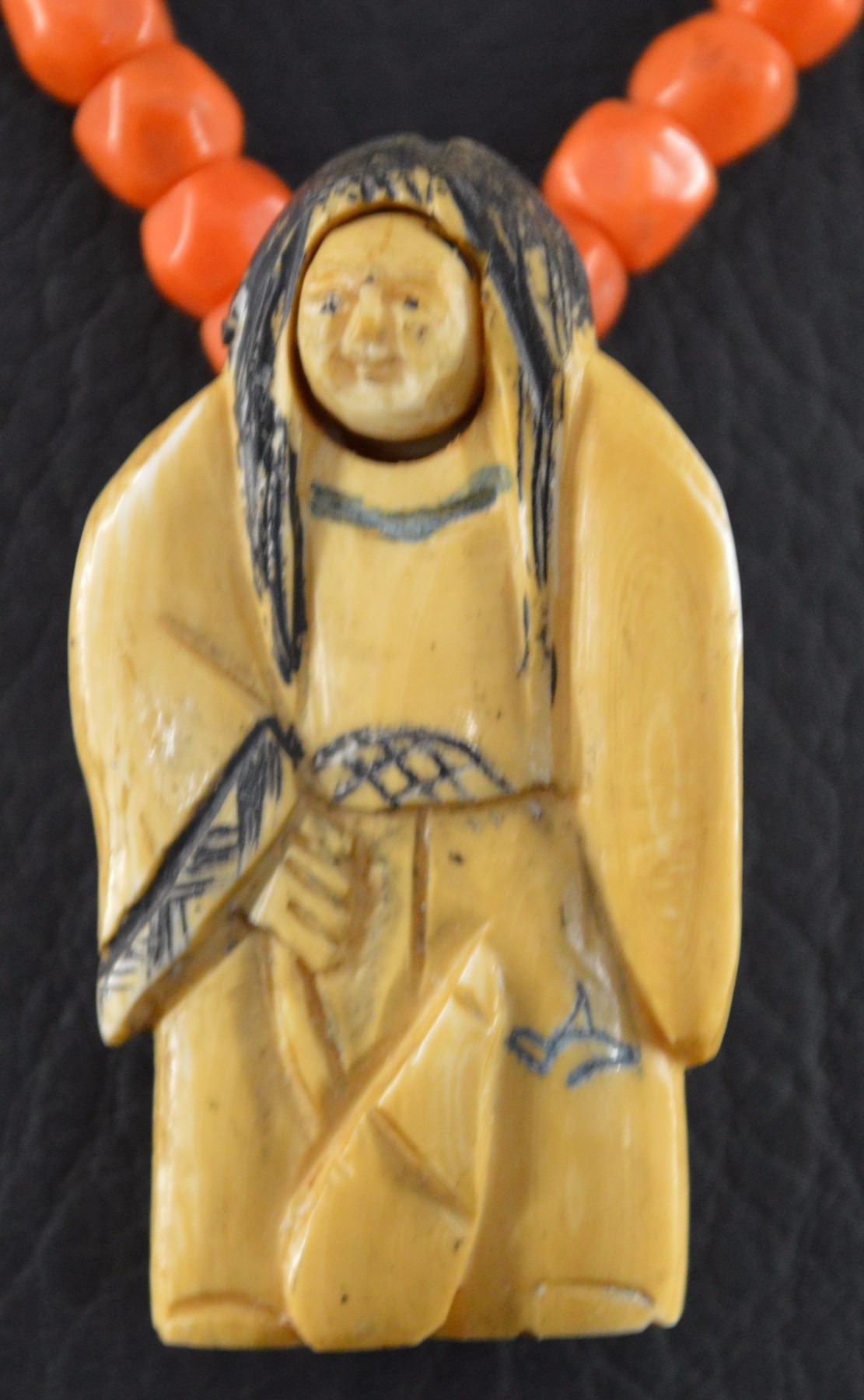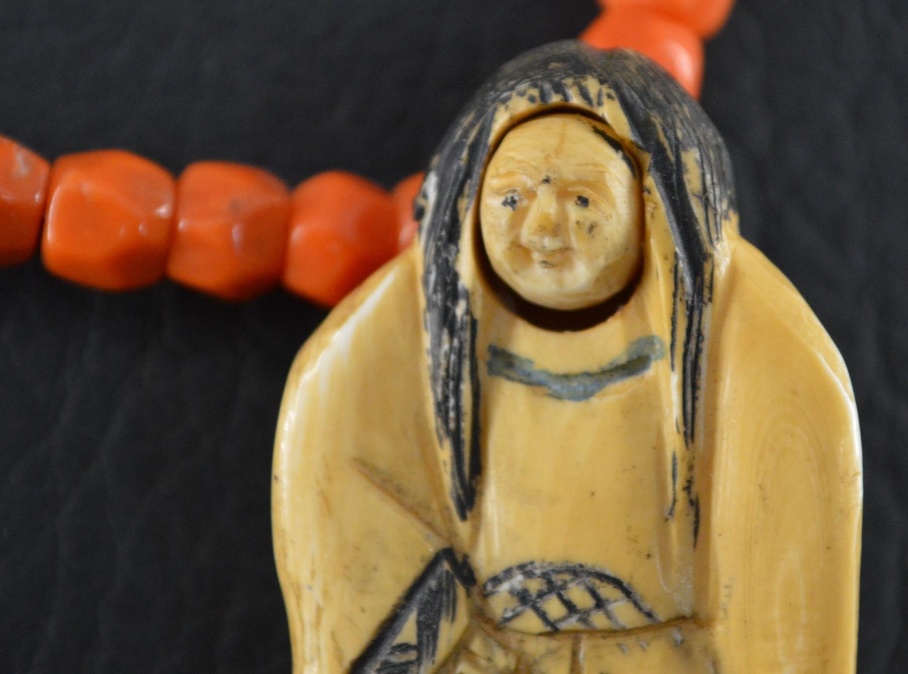 Age unknown. Hand faceted coral beads with two face carved pendant.