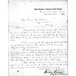 (1827 - 1863) Union brigadier general who led the 69th N.Y. and Corcoran's Irish Brigade, captured at Bull Run and paroled, killed at Fairfax when his horse collapsed on him. Rare war-date L.S. as "Michael Corcoran Brig. Genl Commanding" on "Corcoran's Irish Legion" letterhead, 1p. 8vo., New York, Oct. 4, 1862 to Brig. Gen. Thomas Hillhouse seeking the promotion of James B. Kirkir, Peter McDermott and Patrick McCarthy, and adding at the end: "...After further consideration and investigation, I have concluded to release Colonel McDermott from arrest and restore him to his command...". Very good.
