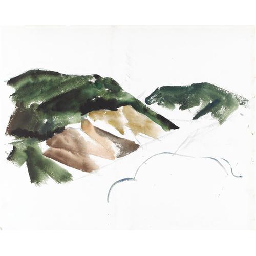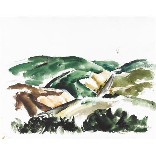 <B>COREEN MARY SPELLMAN (1905-1978)</B></I><BR>Untitled Mountain Landscape with Road, 1933<BR>Watercolor (double sided - verso unfinished)<BR>19in. x 24in.<BR>Unsigned, but documented in Mick Spellman's collection<BR><BR>This watercolor was painted in Provincetown, Massachusetts, while Coreen Spellman was studying with Charles Martin in the summer of 1933.<BR><BR>Provenance:<BR>Estate of Mick Spellman<BR>Acquired from the above by the present owner<BR><BR>Literature:<BR>Picture in, <I>The Artwork of Coreen Mary Spellman (1905-1978),</B></I> by James Graham Baker<BR><BR> <B>Condition Report:</B> Excellent condition. Unframed.<BR><BR><b>Shipping:</b> Requires 3rd Party Shipping (<a target="_blank" href="http://www.heritageauctions.com/common/shipping.php">view shipping information</a>)