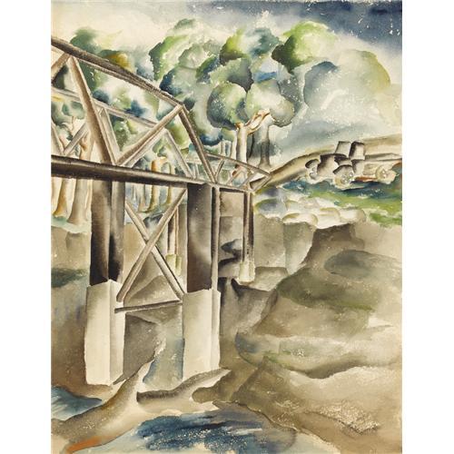 <B>COREEN MARY SPELLMAN (1905-1978)</B></I><BR>Untitled Suspension Bridge, 1930s<BR>Watercolor<BR>14 1/2in. x 11 1/4in.<BR>Unsigned<BR><BR>This wonderful watercolor by Coreen Spellman was found in Mick Spellman's attic after the sale of his estate was over. Therefore, it is not documented in the James Graham Baker book, <I>The Artwork of Coreen Mary Spellman (1905-1978).</B></I> It is sold with a letter from the purchaser stating how and where he found it in the attic.<BR><BR>Provenance:<BR>Estate of Mick Spellman<BR>Acquired from the above by the present owner<BR><BR> <B>Condition Report:</B> Excellent condition. Unframed.<BR><BR><b>Shipping:</b> Requires 3rd Party Shipping (<a target="_blank" href="http://www.heritageauctions.com/common/shipping.php">view shipping information</a>)