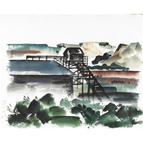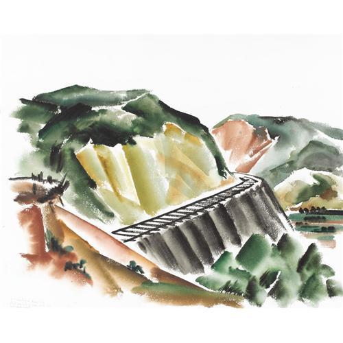 <B>COREEN MARY SPELLMAN (1905-1978)</B></I><BR>Untitled Mountain Landscape with Railroad Tracks, 1933<BR>Watercolor (double sided)<BR>19in. x 24in.<BR>Unsigned, but documented in Mick Spellman's collection<BR><BR>This watercolor was painted in Provincetown, Massachusetts, while Coreen Spellman was studying with Charles Martin in the summer of 1933.<BR><BR>The following notes in pencil appear "good painting in near hill, ghost painting in near sand cut, rail road neat."<BR><BR>Provenance:<BR>Estate of Mick Spellman<BR>Acquired from the above by the present owner<BR><BR>Literature:<BR>Picture in, <I>The Artwork of Coreen Mary Spellman (1905-1978),</B></I> by James Graham Baker<BR><BR> <B>Condition Report:</B> Excellent condition. Unframed.<BR><BR><b>Shipping:</b> Requires 3rd Party Shipping (<a target="_blank" href="http://www.heritageauctions.com/common/shipping.php">view shipping information</a>)