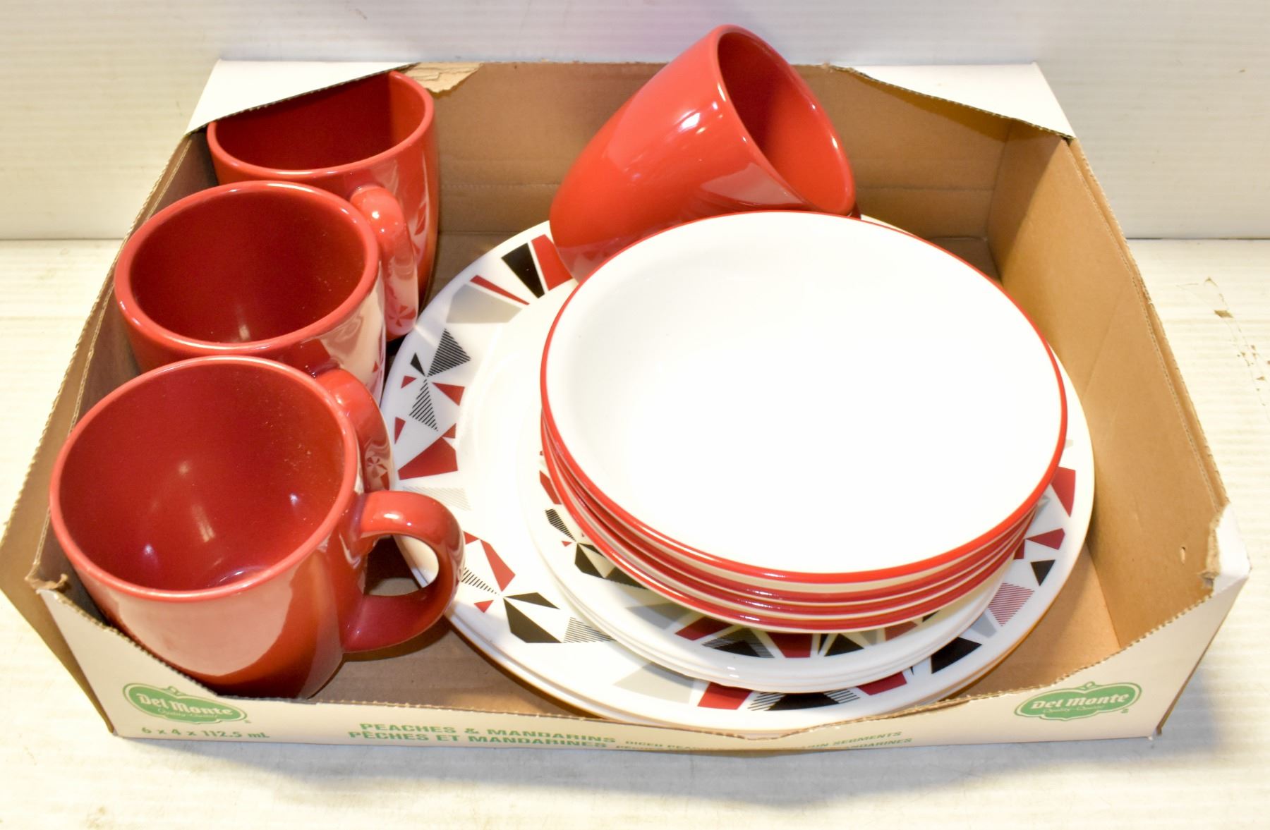 BOWLS, 4 LARGE PLATES AND 4 MATCHING MUGS