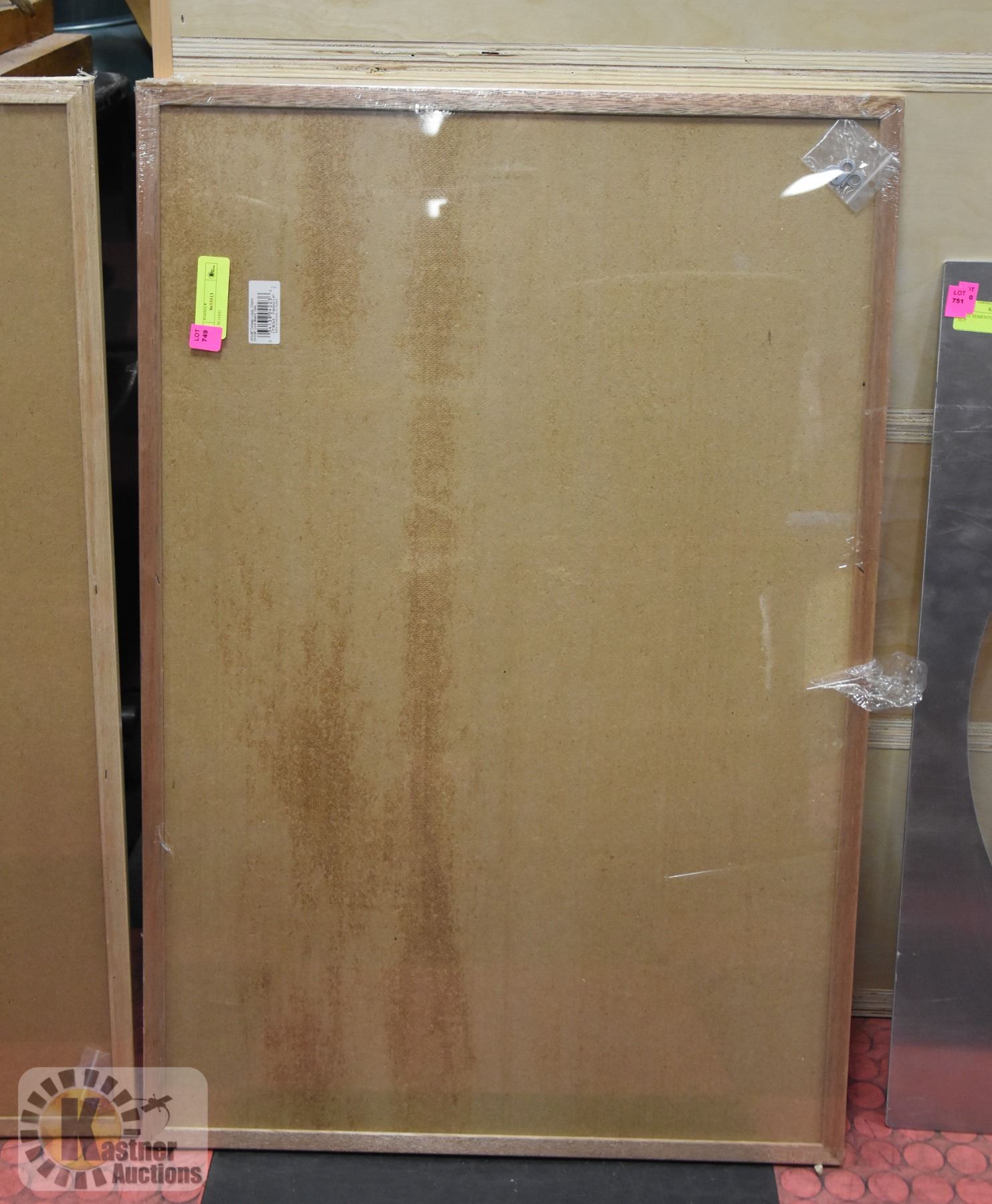 24 INCH X 36 INCH CORK BOARD WITH OAK FRAME AND MOUNTING HOOKS