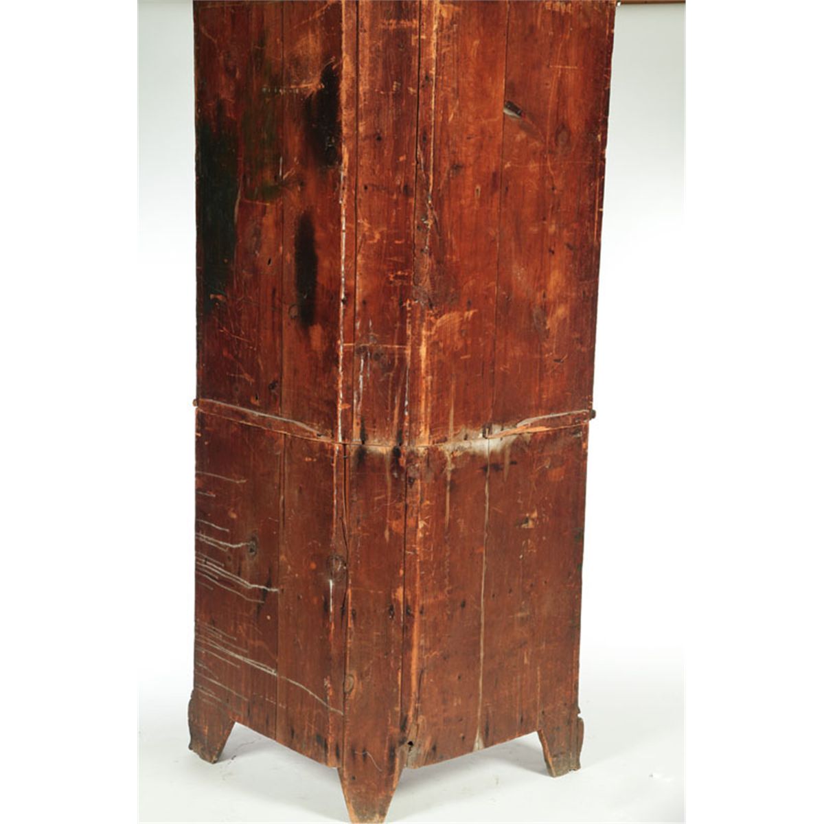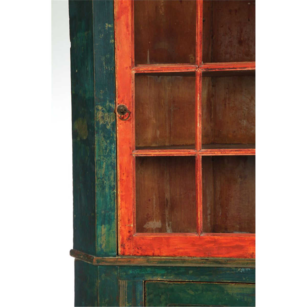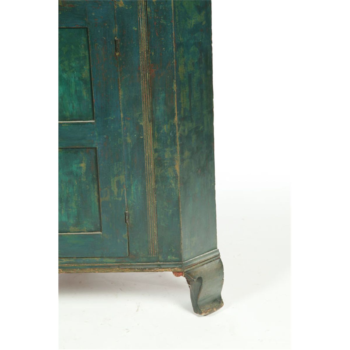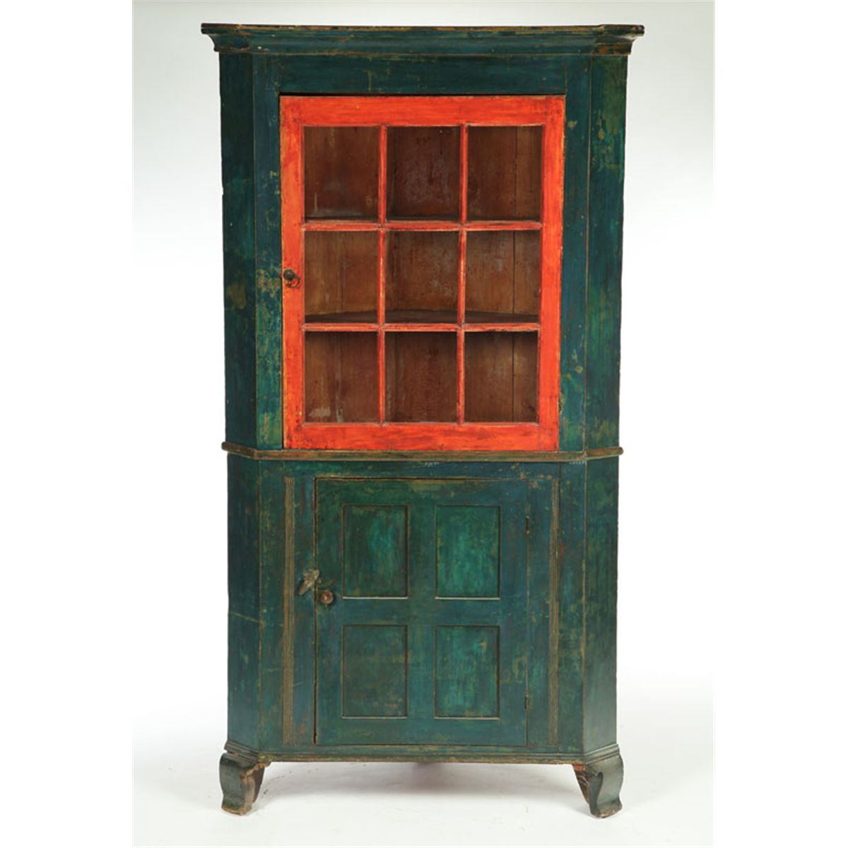 Lehigh County, Pennsylvania, early 19th century, cherry, pine and poplar. Two-piece, the upper section with nine panes and molded mullions; the lower section with a paneled door, all resting on ogee bracket feet. Retains its original blue and red paint. Minor repairs to the cornice. 81"h. 46"w. 20"d., requires a 32" corner. Ex Glenn Parker (Pennsylvania), ex Keith Collis (Pennsylvania), ex Joan Rabb (Pennsylvania).