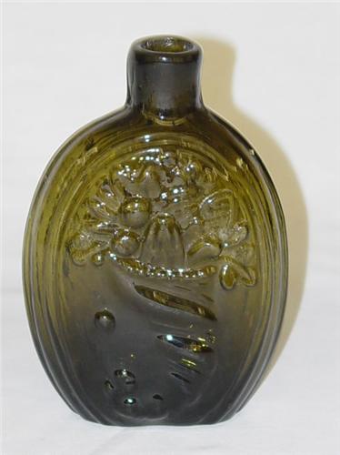 CORNUCOPIA & URN 1/2 PINT FLASK G3-8 - DEEP OLIVE GREEN W/ OPEN PONTIL