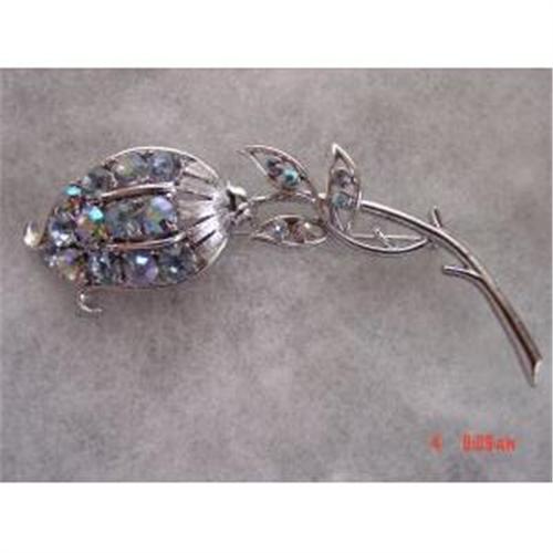 Here is a signed wonderful CORO blue aurora borealis rhinestone flower brooch. Is this a tulip?? Some sort of a flower. It is 3 1/2 inches long and in excellent condition. There is silver colored rhodium metal. All stones appear original and intact