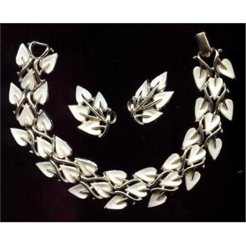 <table width="100%" border="0" cellspacing="0" cellpadding="4"><tr><td><em> </em></td></tr><tr> <td width="100%"> This silvertone metal bracelet is just lovely. It has a myriad of painted white leaves. The bracelet measures 3/4 inches wide and 7 3/4 inches long. It has a foldover locking clasp. The matching clip style earrings measure 1 1/4 inches tall. The set is in good condition and is marked, CORO. </td></tr><tr> <td> </td></tr><tr> <td>Reference #: sjcoroset1</td></tr><tr><td>Condition:excellent</td></tr><tr><td>Year:1940-1960s</td></tr><tr><td>Maker:CORO</td></tr><tr><td>Title:CORO Enamel Leaf Bracelet Earring Set</td></tr><tr><td>Location:Missoula Montana</td></tr></table>
