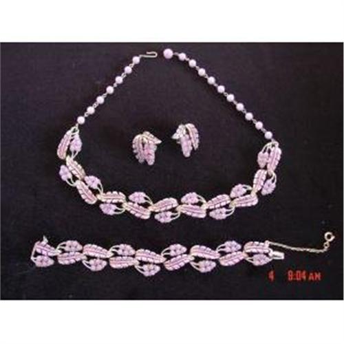 Here is one of the most fabulous Signed CORO Vintage Fruit salad parures I have ever seen. This is from the 1930-1950s. It is in excellent condition. the necklace measures 17 inches long. there are wonderful light purple fushia colored beads, either lucite, glass or stone? There are 11 individual links on this necklace, each link has 5 individual fushia beads with fushia purple enamal on the leaves!! Just incredible quality. This set appears to have never been worn. There is an adjustible clasp so that it can be worn either higher or lower to fit all neck sizes. The bracelet is identical to the necklace and measures 7 inches, it has 9 individual links with a safety chain. The earrings are clipped and each one has 1 link with 7 individual fushia colored beads!
