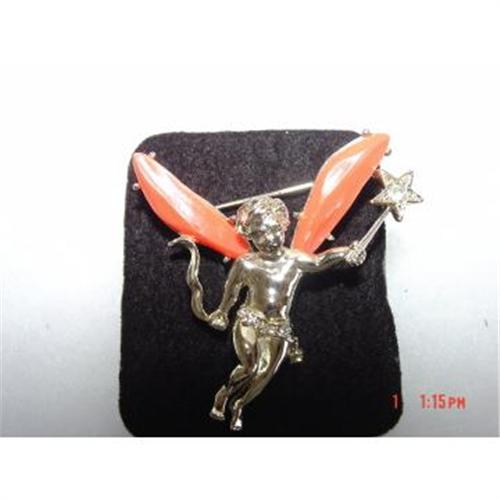 Here is a signed lovely orange lucite rhinestone angel pin or brooch It is signed CORO. It is in excellent condition. There are several clear rhinestones around its belt line, therre is a rhinestone in the star it is holding.