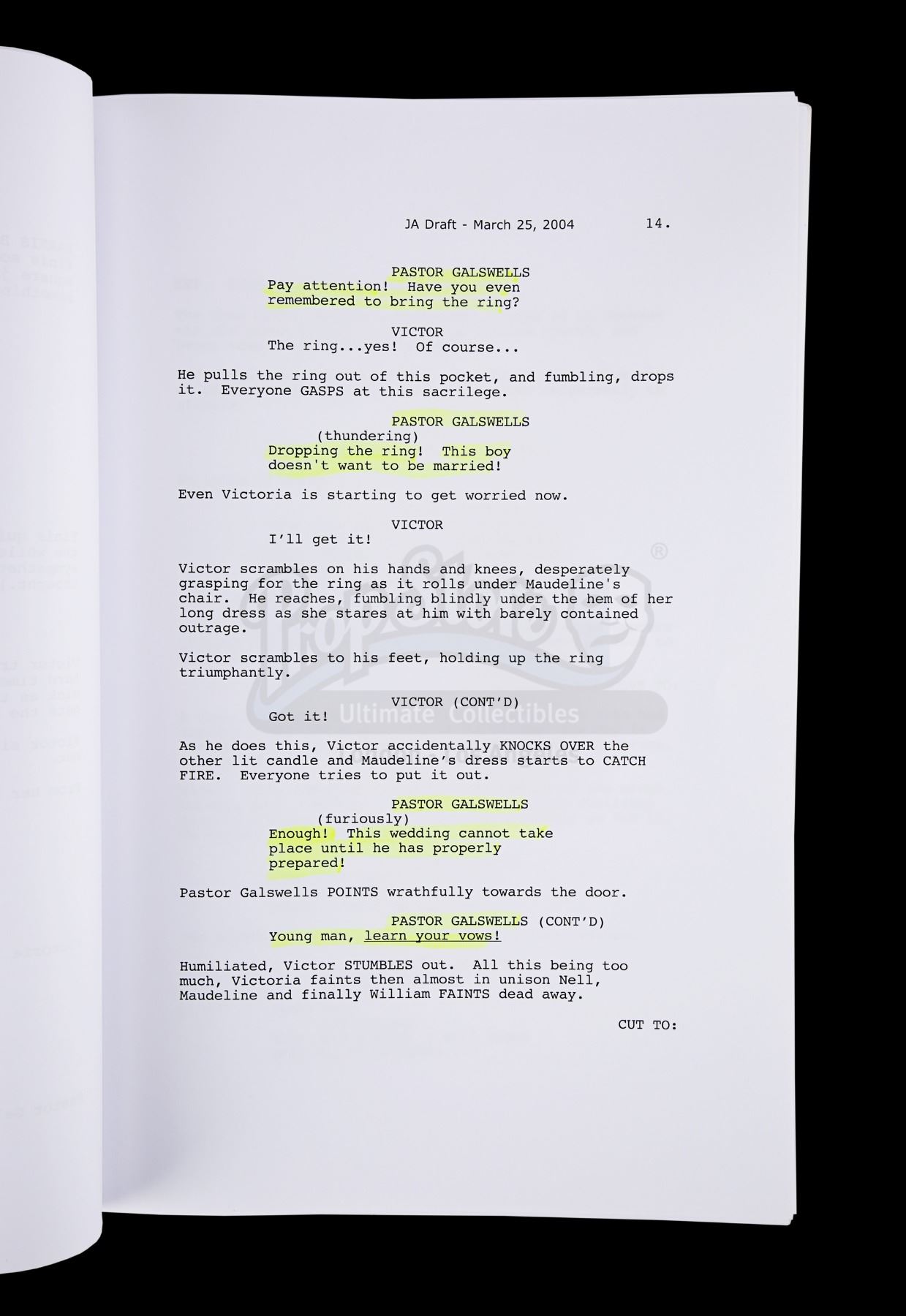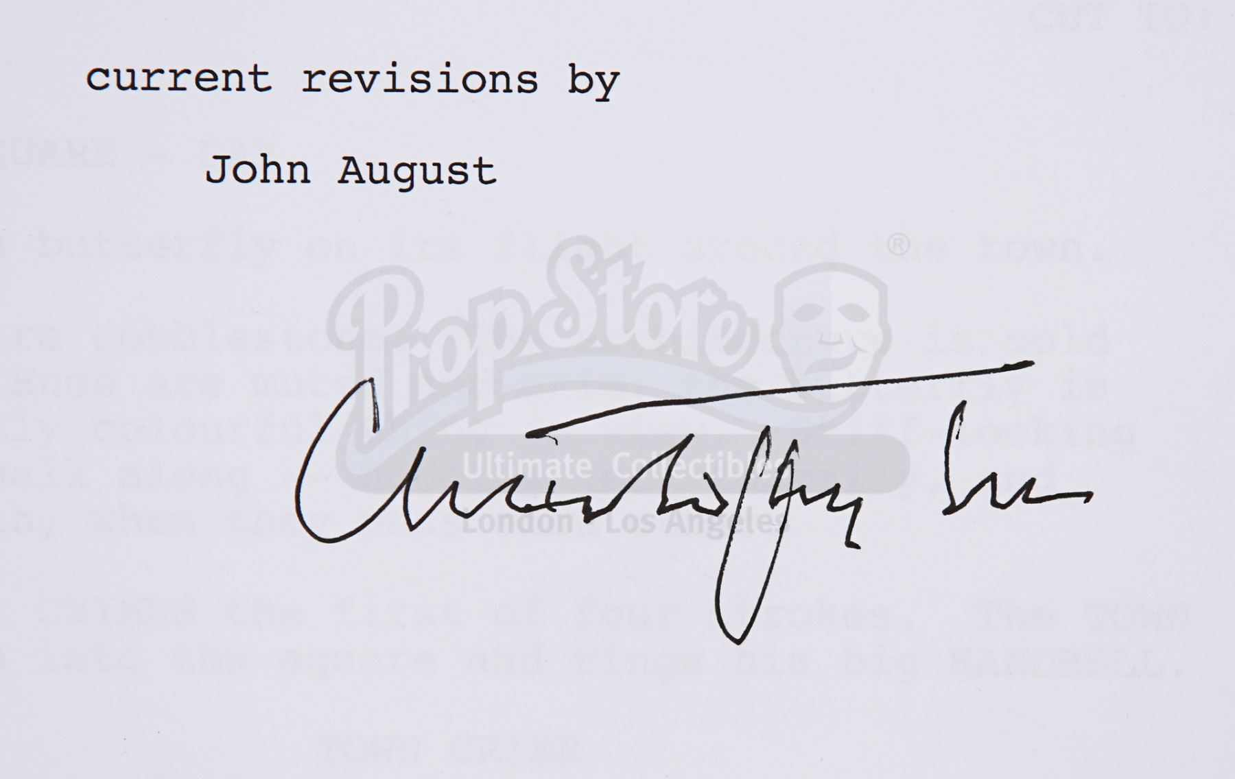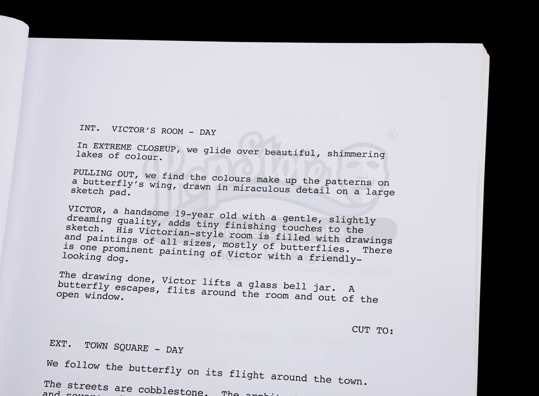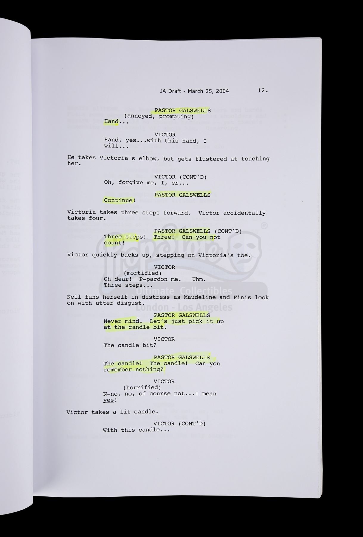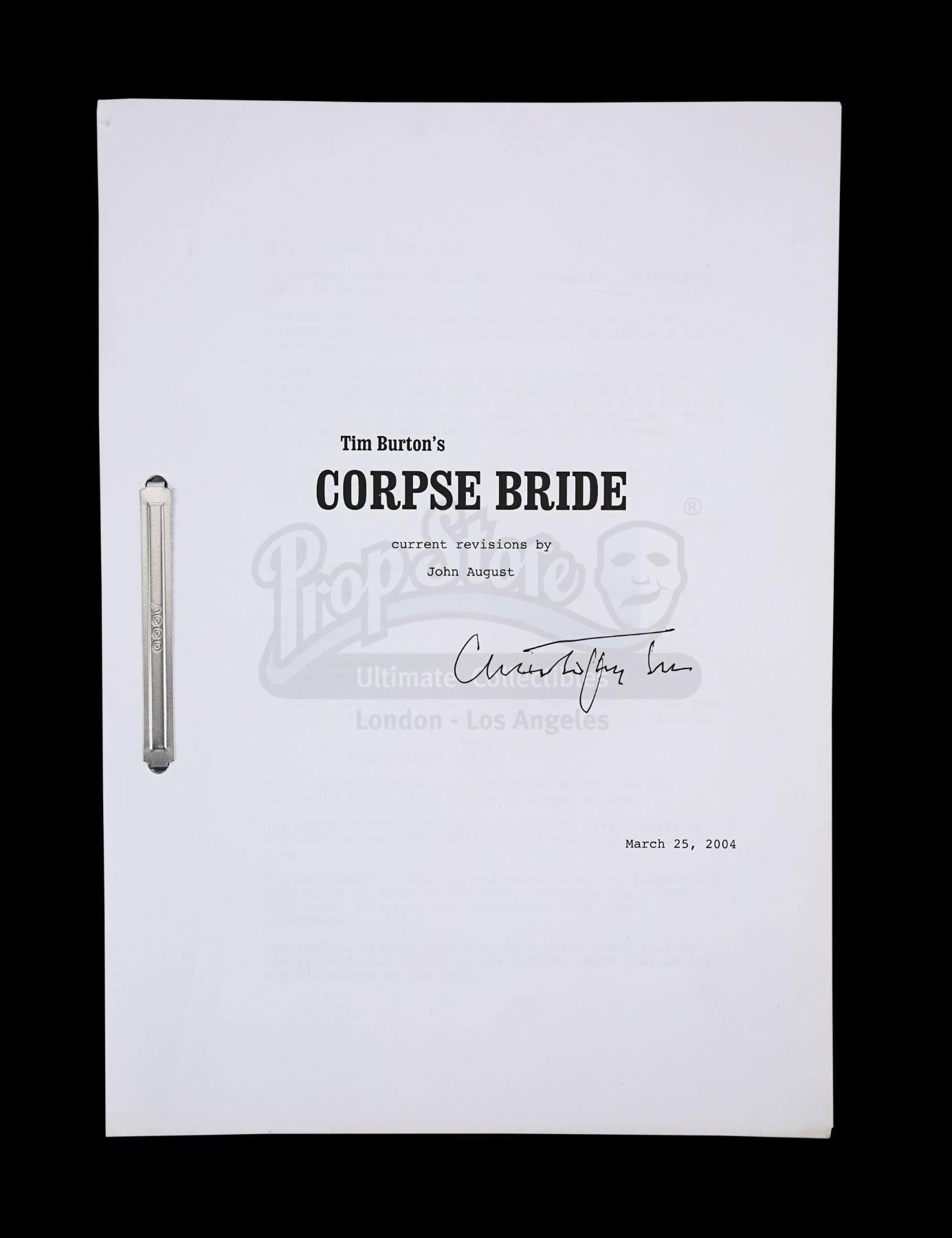 Sir Christopher Lee's personal revised script from the production of Tim Burton's stop-motion film Corpse Bride. This lot comes from the personal collection of legendary actor Sir Christopher Lee. Dated "March 25, 2004" and bound by a metal script clip, the script's cover page bears the production title printed in black, with Burton's name situated above and revisions credited to John August. The script consists of 71 pages, printed single-sided on white A4 paper, and the lines for Lee's character Pastor Galswells are highlighted in yellow. The cover page is autographed by Lee in black ink. The lot displays signs of production use, including a vertical fold line on the back page, light creasing and minor wear around the page edges. Dimensions: 30 cm x 21 cm x 1 cm (11 3/4" x 8 1/4" x 1/2")