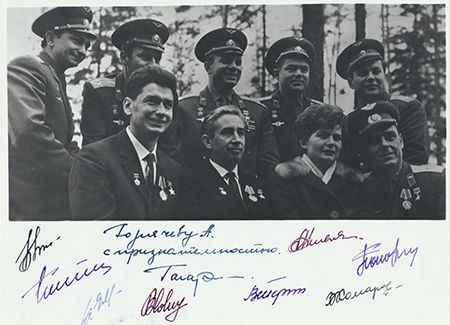 A fine S.P. 8 1/2" x 6 1/4" b/w, shows, shows the first nine cosmonauts in a group pose and signed by each, with YURI GAGARIN penning the sentiment to a Goryachev. Fine condition, ideal for display.