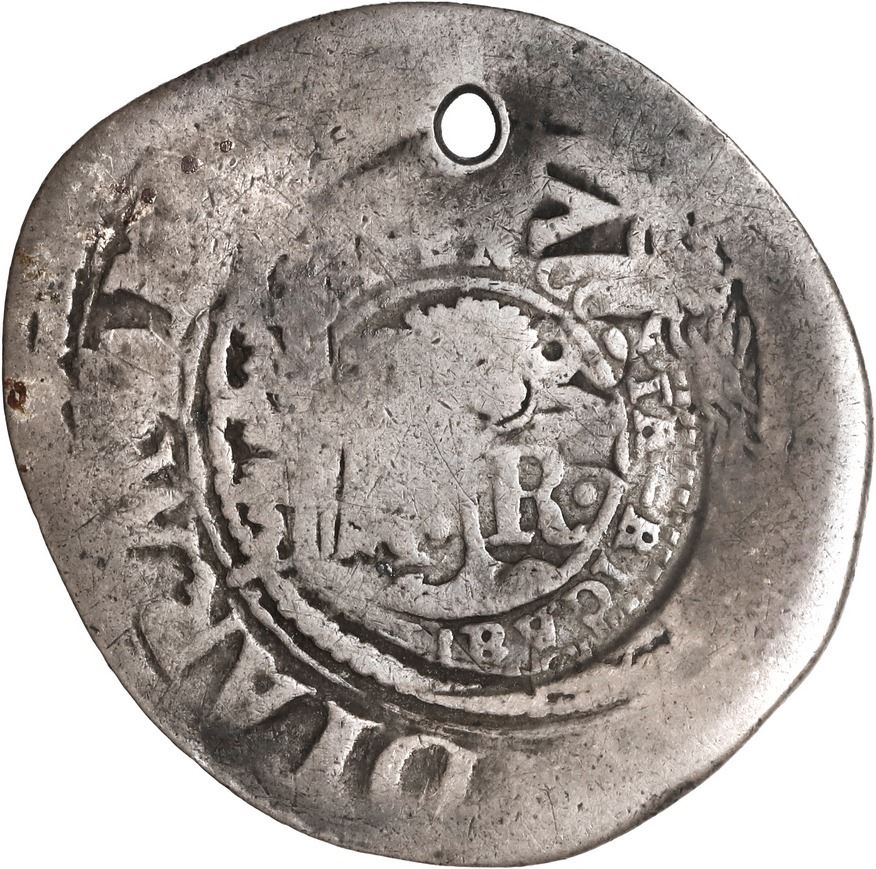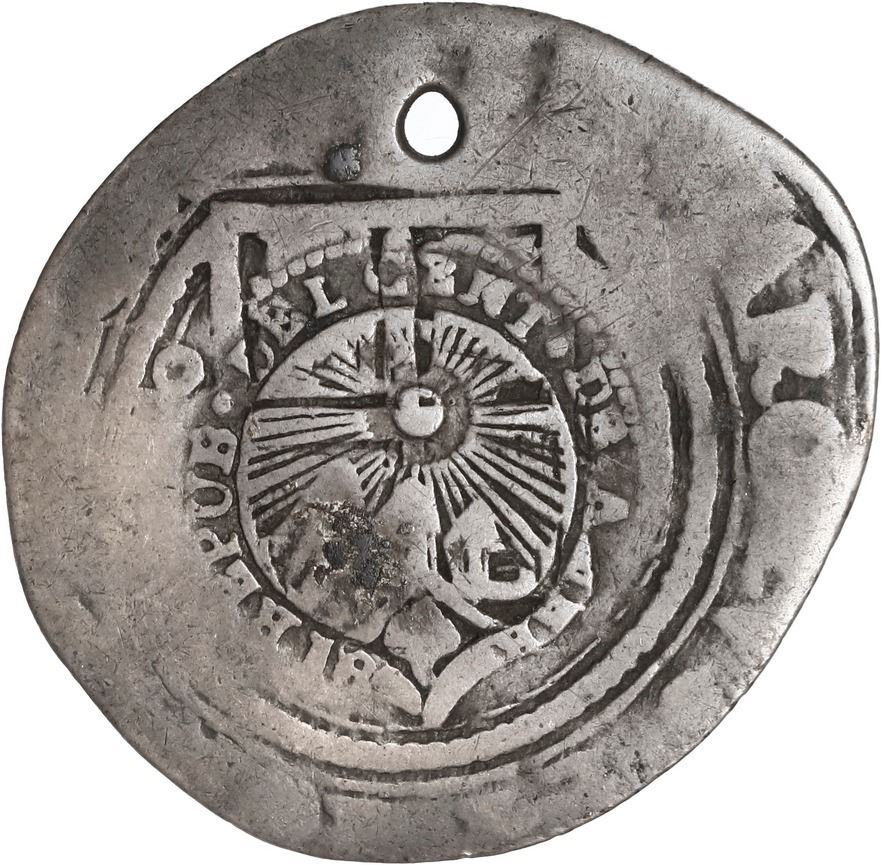 COSTA RICA, 1 real, 1846 JB counterstamp (Type IV) on a Mexico City, Mexico, 1 real, Charles-Joanna, "Late Series," assayer not visible, rare, ex-Hubbard. KM-unl (cf 47). 2.70 grams. Nearly full counterstamp (VG) on a very early host not listed in KM (about 300 years' difference!) with some clear legend but rather worn (Fair), nicely toned, small hole near edge, possible old solder-mark on shield side. Pedigreed to the Clyde Hubbard Collection, with his tag.