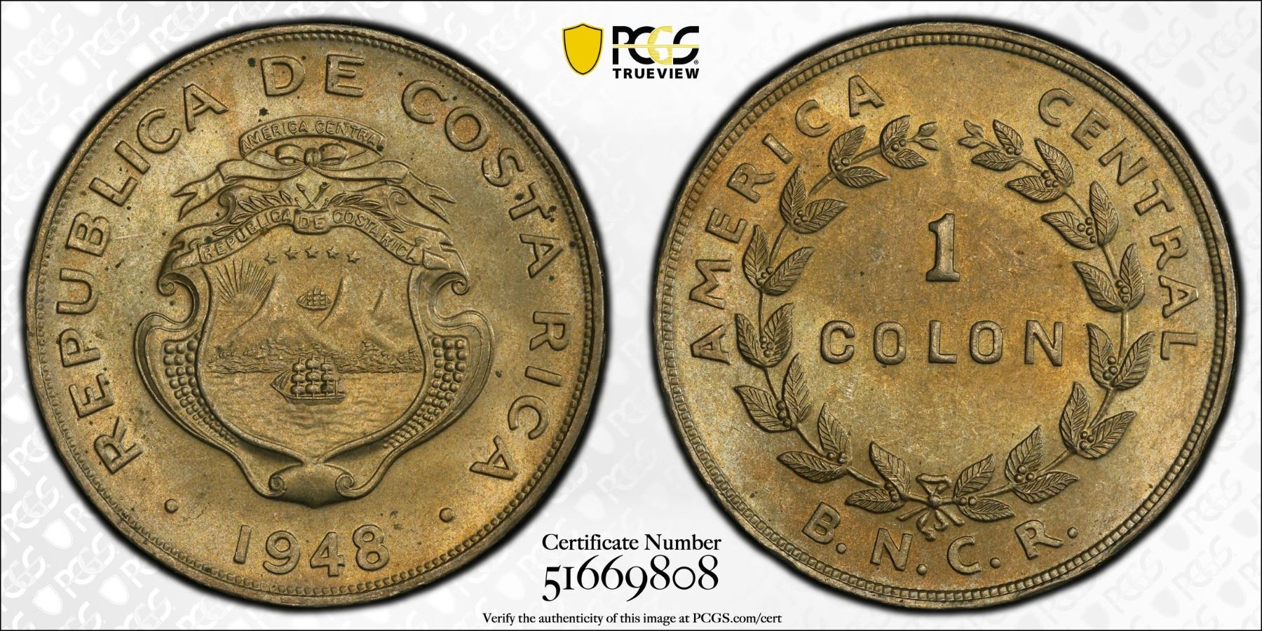 COSTA RICA: Republic, 1 colon, 1948, PCGS MS64