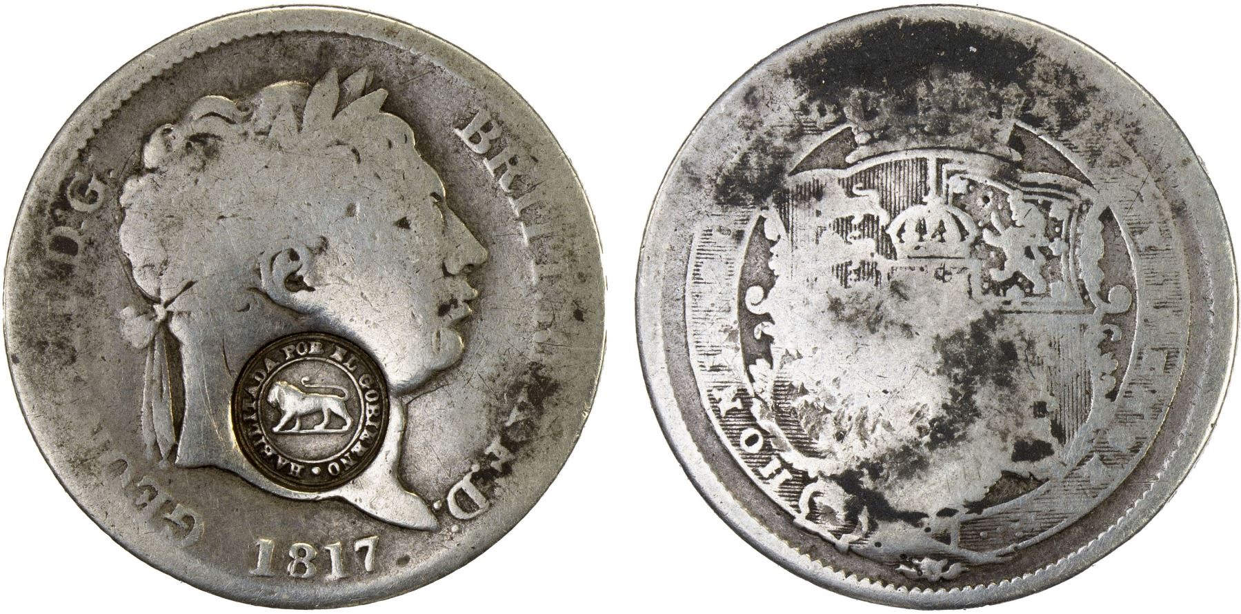 COSTA RICA: Republic, AR real, ND (1849-57), KM-90, Type VII countermark on 1817 Great Britain sixpence (KM-665), VF on worn host.