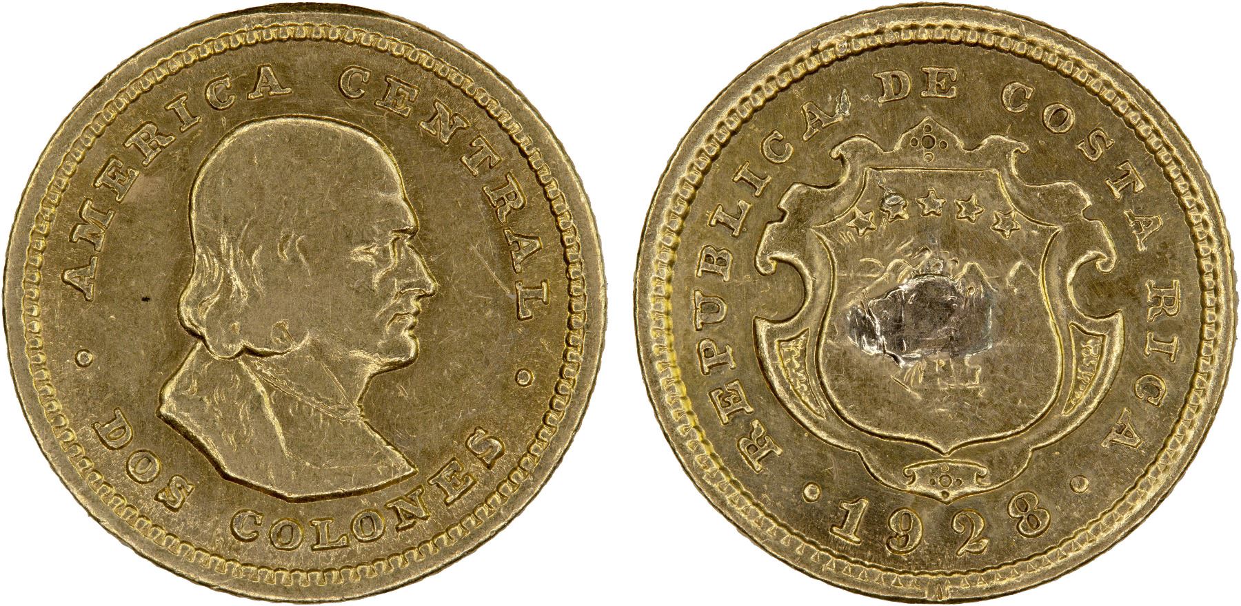 COSTA RICA: Republic, AV 2 colones, 1928, KM-139, lightly cleaned, ex Dr. Robert A. Rosenfeld Collection.