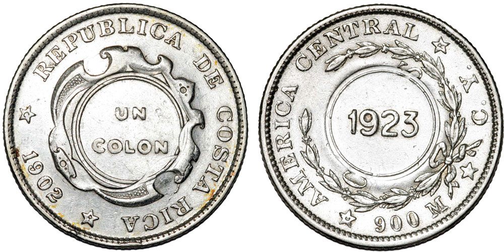 COSTA RICA, UN COLON, 1923, COUNTERSTAMPED 1923 ON 50 CENTIMOS, 1902CY. AXF, SCARCE