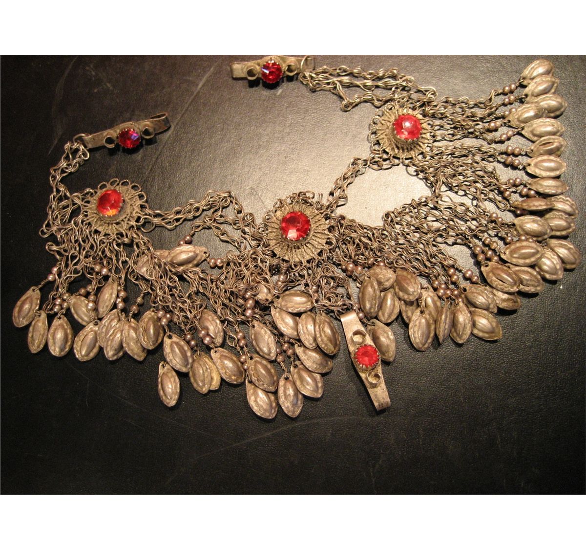 (1) COSTUME JEWELRY SILVER TONE NECKLACE WITH RED RINESTONE ETHNIC STYLE