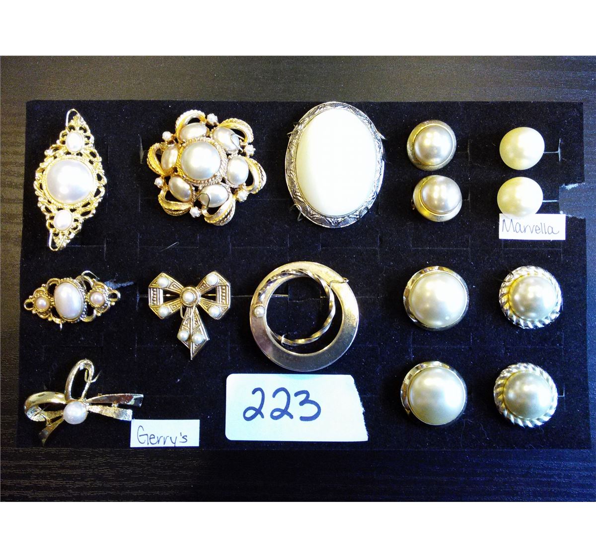 4 PAIRS OF EARRINGS ONE SIGNED MARVELLA - 7 GOLD TONED WITH FAUX PEARL BROOCHES