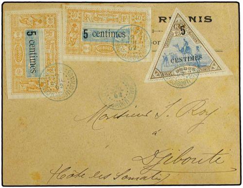 1902 Envelope to Djibouti bearing Cote de Somalis 5 on 4 c orange and blue (2) (Yvert 28) mixed with Obock 5 c on 25 f brown and blue (Yvert 35) tied by DJIBOUTI COTE FRANCAISE DES SOMALIS datestamp in blue. Very fine item.