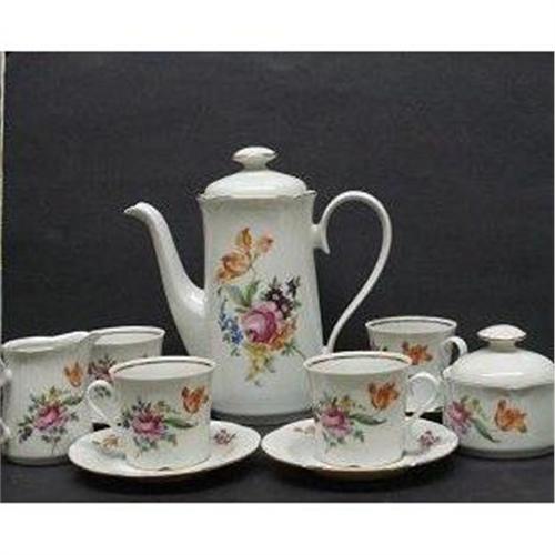 GORGEOUS FLORAL HOT CHOCOLATE OR COFFEE SET, CONSISTING FROM TALL POT, CREAM AND SUGAR, 4 CUPS AND 4 SAUCERS - All in excellent seems never used condition, Made by Henneberg Porcelain - German Democratic Republic - Pot stands 9 1/2" tall, creamer 3 1/2",sugar bowl 3 1/2" and each cup stands 2 3/4" tall, LOVE THE FLORAL DECORATIONS A WONDERFUL GROUPING OF FLOWERS THAT IS SO TYPICAL OF GERMAN MADE CHINA AND PORCELAIN, I REMEMBER, AS YOUNG CHILD ADMIRING MY GRANDMOTHERS CHINA WITH THE SAME GROUP OF FLOWERS MEMORIZING EACH OF THEM, EVEN THE COLORS SEEM TO BE THE SAME - US Buyer to pay 12.00 for shipping plus insurance.THANKS.