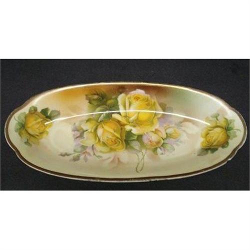 BEAUTIFUL LARGE OVAL SERVING DISH, MADE BY S.E.and what it looks like PROSFNIA , IT IS DECORATED DEPICTING GORGEOUS YELLOW ROSES,as per images - Excellent condition but for tiny chip on underside of the edge close to handle - Measures about 11 3/4" X 5 1/4" x 1 1/2", US Buyer to pay 8.00 for shipping plus insurance.THANKS.
