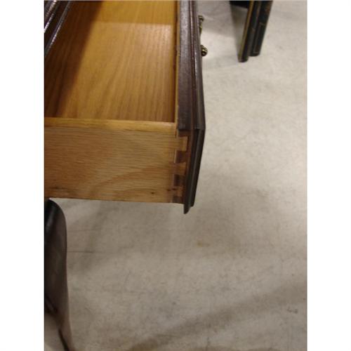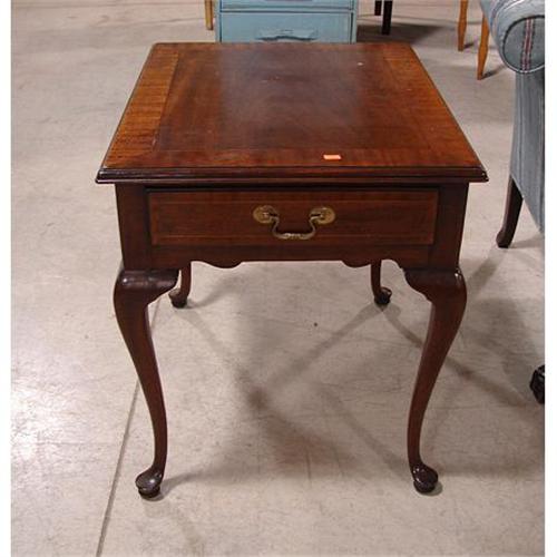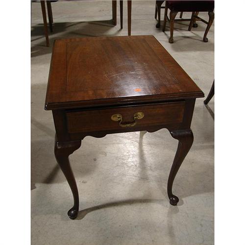 PAIR OF COUNCILL WALNUT QUEEN ANNE STYLE END TABLES. Banded tops with single dovetailed drawers on pad feet. Marked on inside of drawers. 24.5” H, 21” W, 26” D