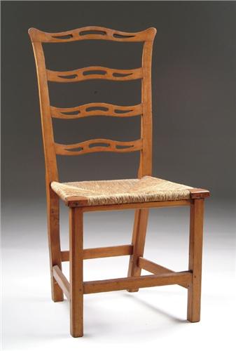 COUNTRY ANTIQUE CHIPPENDALE RIBBON-BACK SIDE CHAIR. Four horizontal pierced slats, rush seat, square legs with molded corners. SIZE: 38in. h x 17-1/2in. seat h. CONDITION: Refinished, very good. 9-26049