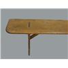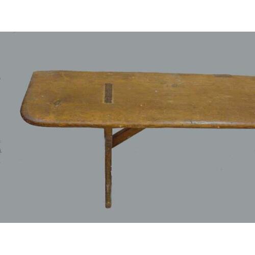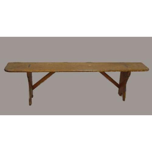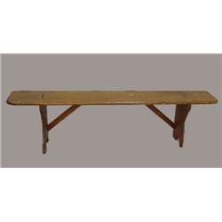 COUNTRY BENCH. Refinished pine. The scalloped legs are mortised through the top and have cyma curved cutouts on the bottoms. One-board top. 72"l. 12 1/4"d. 19"h.