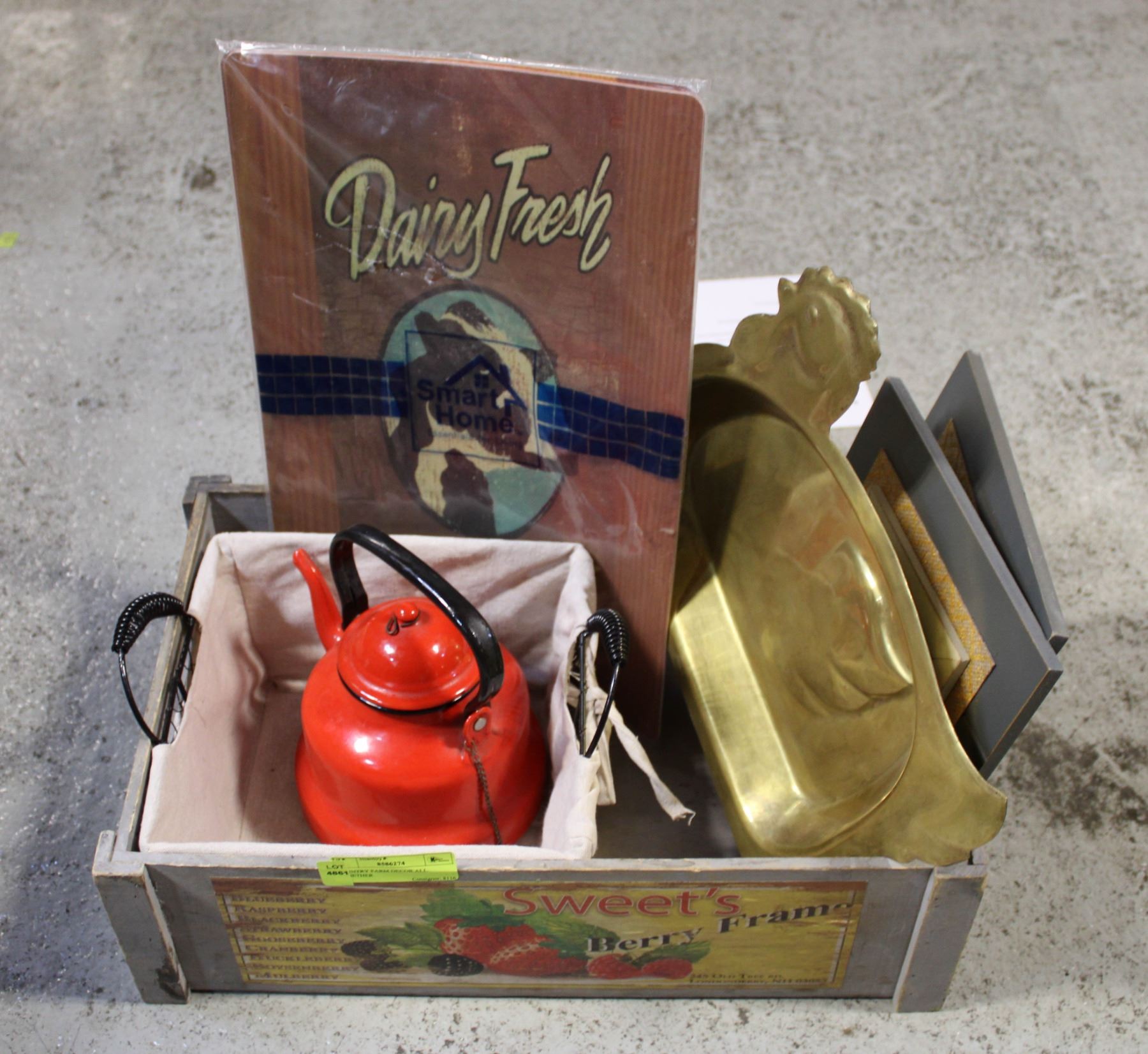 CUTTING MATTS, BRASS CHICKEN PLATTER, RED METAL KETTLE, CHICKEN WIRE BASKET & FRAMES ALL TOGETHER