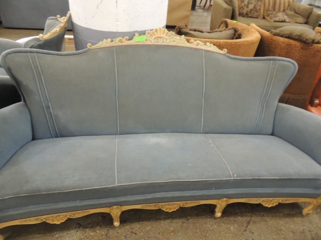 BLUE VELVET SOFA AND CHAIRS. FRENCH COUNTRY. 80" LONG. SOFA. AS SHOWN SEE PHOTO FOR MORE DETAILS.