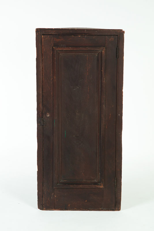 American,19th century, pine. Old greyish green paint. Single door with applied molding. Imperfections. 48"h. 15 1/2" corner.